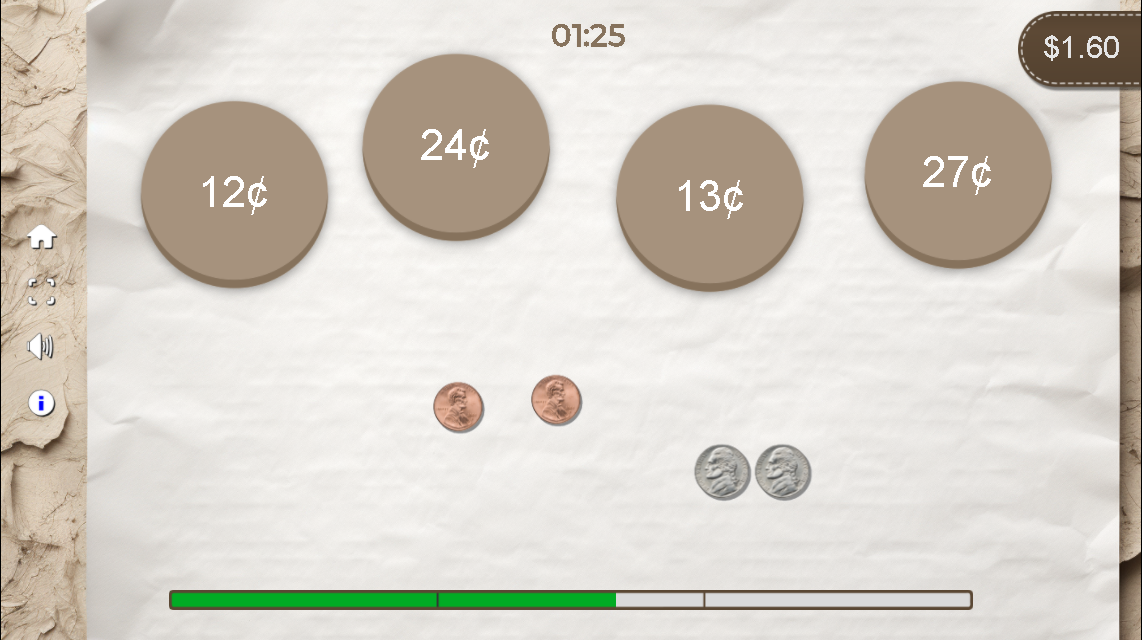 Mainkan dalam mode pemula untuk memungkinkan kombinasi uang tunai apa pun mencapai jumlah target yang diinginkan, atau pilih mode ahli untuk menguji kemampuan Anda dalam mencapai jumlah target dengan menggunakan uang kertas dan koin seminimal mungkin.